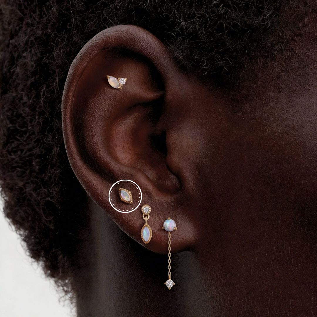 A petite stud shaped into a refined marquise silhouette, centered with a luminous opal that glows softly from within. Minimal bead-edge detailing frames the stone, giving the piece a delicate texture that complements its slender proportions. Designed for effortless layering, it serves as a subtle focal point or an elegant supporting accent for curated piercings.